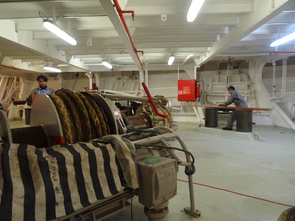 | A wooden railing is getting sanded down and re-varnished here in the anchor room. Oftentimes areas on board end up being used as a workshop - to spare guests from noise and paint smells. |